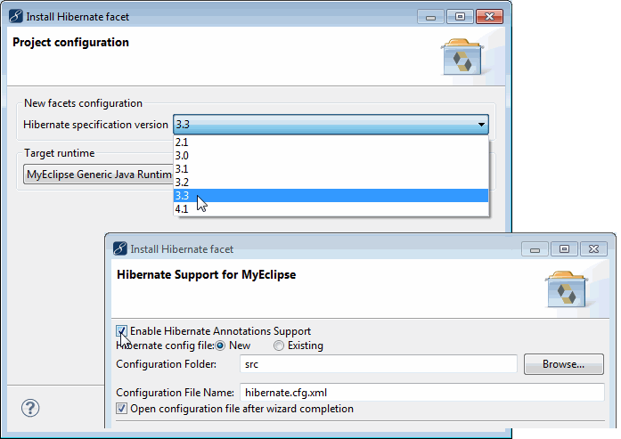 注意:为了在逆向工程过程中为Hibernate 3.x提供注释支持,必须在Active Configuration File字段中选择Hibernate配置文件,或者为SessionFactory选择Spring bean配置文件和 AnnotationSessionFactoryBean。