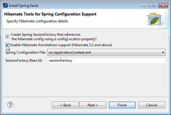 在第3页上添加Spring功能时,请选中“Enable Hibernate annotation support”复选框。这将创建一个AnnotationSessionFactoryBean,而不是LocalSessionFactoryBean。在使用注释时,AnnotationSessionFactoryBean是必需的。