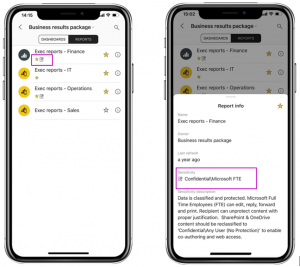 在Power BI移动应用程序(IOS和Android)中查看报告和仪表盘时,也可以看到应用于报告和仪表盘的灵敏度标签。