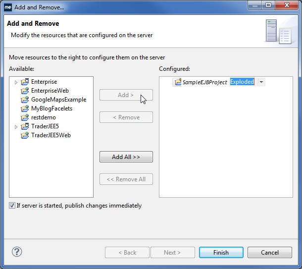 在可用列中选择SampleEJBProject,单击“Add”,然后单击“Finish”。