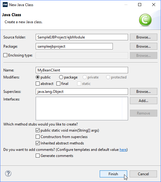 在“Name”字段中输入MyBeanClient,然后选择Public static void main复选框,让MyEclipse为其生成主方法。单击Finish。