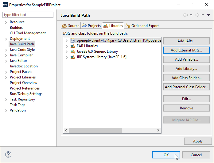 在将代码添加到客户端并运行之前,需要将openejb-client-4.7.4.jar添加到构建路径。该JAR来自TomEE库文件夹,是可实现EJB远程调用规范的客户端。
