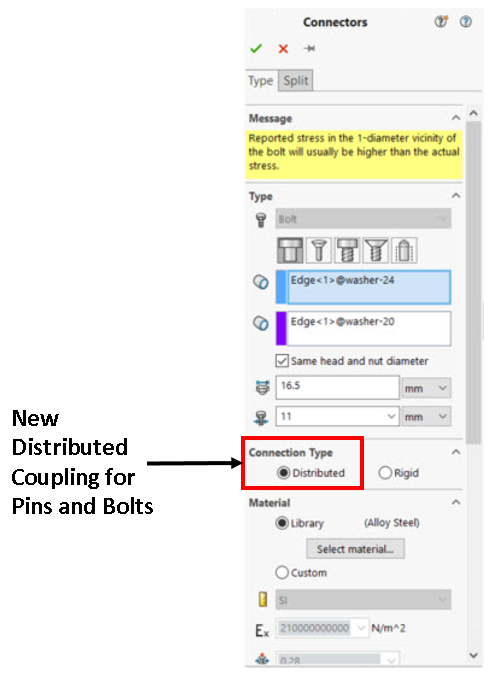 SolidWorks 2020中的分布式耦合是销钉和螺栓连接器的改进公式,它允许连接到销钉和螺栓连接器的面变形,从而更真实地表示连接器的行为。因此,这项新功能为仿真模型带来了更高的准确性,使您能够更快地构建更好的产品。