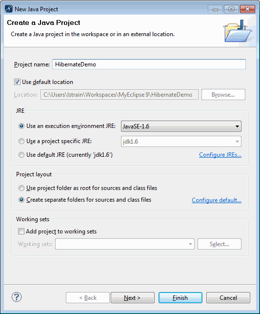 在“HibernateDemo”字段中键入HibernateDemo,然后单击“完成”。