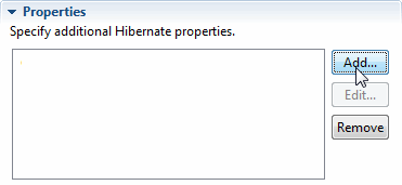 完成添加Hibernate功能的向导后,hibernate配置文件将自动打开。如果在添加功能时跳过了数据源配置,那么现在需要使用以下步骤进行操作。如果您已经配置了数据源,请继续添加属性。