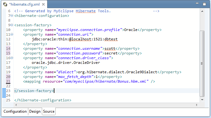 下图显示的是完成上述步骤后的Hibernate配置文件源。