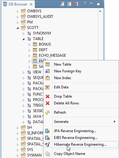 右键单击该表,然后选择“Hibernate Reverse Engineering”。或者从数据库浏览器中拖动表,并将它们放到Hibernate Configuration编辑器中以启动向导。
