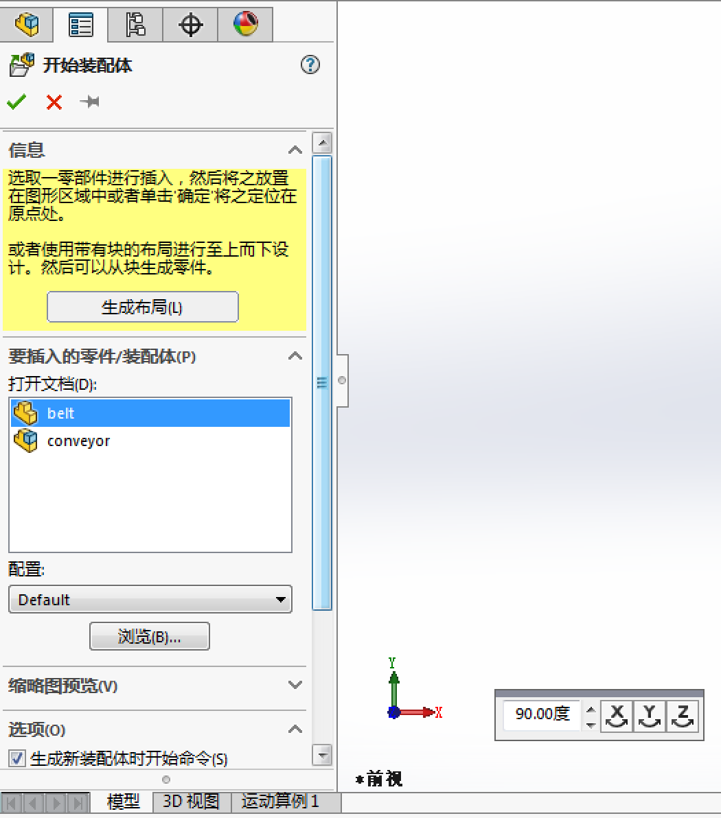 如果打开文档下没有可用的部件,则打开打开对话框,以便您可以浏览要插入的零部件。要禁用开始装配体 PropertyManager 的行为,请清除此选项。