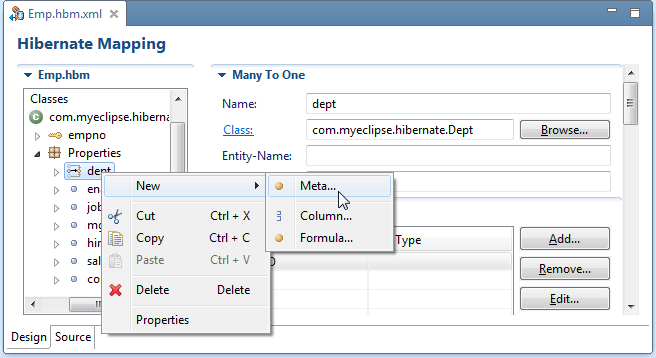 第二种类型的配置文件是映射描述(文件扩展名* .hbm),它指示Hibernate如何在特定的Java类和一个或多个数据库表之间映射数据。MyEclipse提供了用于处理所有这些配置文件类型的工具,并在您更改数据库和Hibernate映射的Java类时使它们保持同步。编辑器具有以下功能:
