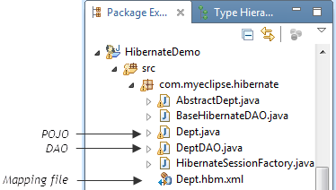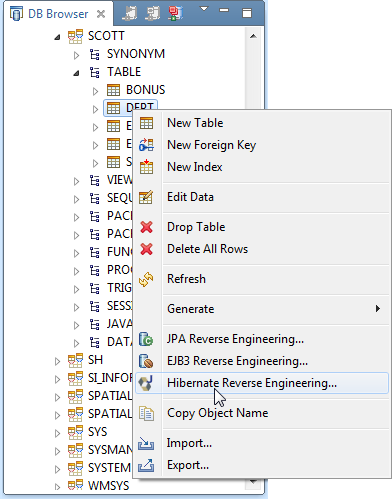 在Database Explorer透视图中,可以查看所连接的数据库的内容。在DB浏览器中,右键单击要反向工程的表,然后从菜单中选择Hibernate Reverse Engineering。完成向导后,系统将提示您切换到Hibernate透视图。