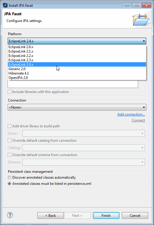 将JPA构面添加到已经具有Spring构面的项目时,您可以选择高级Spring-JPA支持(反之亦然)。这种级别的支持使JPA工具可以与项目的Spring工件一起使用。下图显示了Spring-JPA项目配置向导。