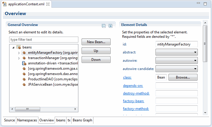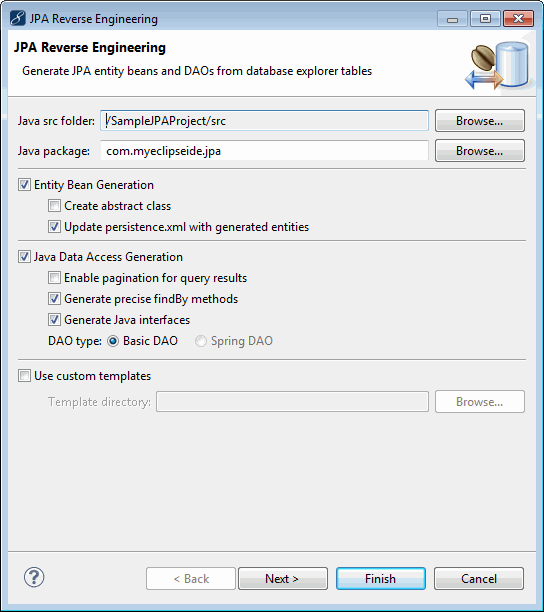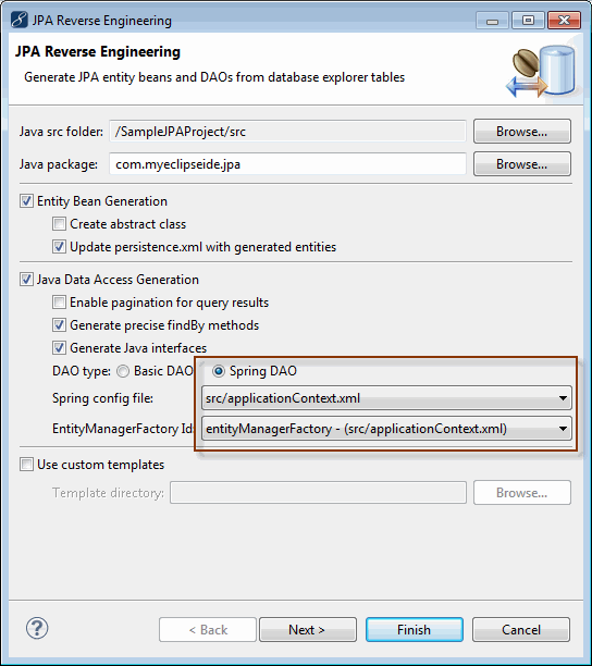 对于配置为支持高级Spring-JPA功能的项目,除了从数据库架构生成实体类之外,还可以生成与Spring兼容的DAO。在逆向工程过程中,将使用每个DOA类的生成的bean条目更新Spring应用程序上下文文件。