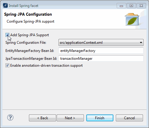 选择Spring-JPA支持,主要bean配置文件,并自定义bean id和事务支持。