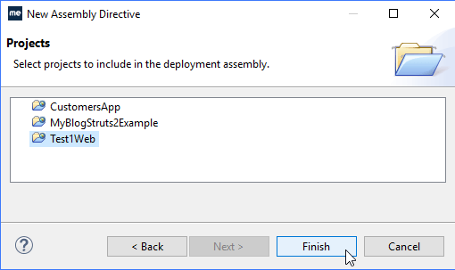 选择Test1Web项目并单击Finish。如果列表为空,则没有可以与该EAR项目关联的现有项目。