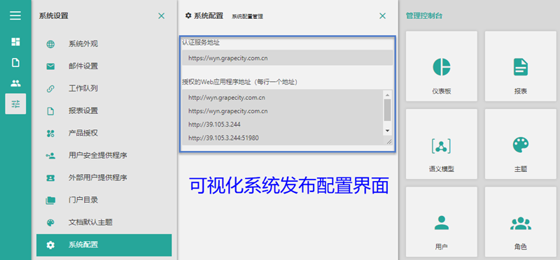 在Wyn Enterprise的后台管理网站中,便能配置该程序对外发布的正式地址/网站,不再需要手动修改软件配置文件,发布更加容易。