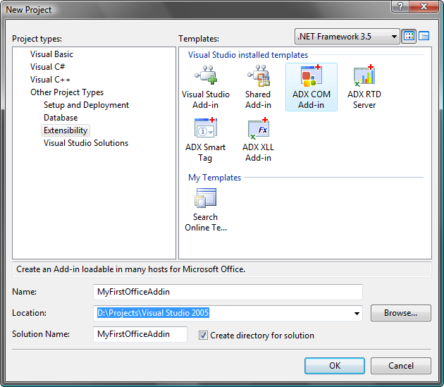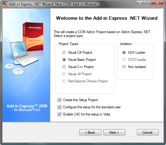 Add-in Express .NET is the first visual tool for programming Microsoft® Office extensions, including COM add-ins, smart tags, RTD servers and Microsoft Excel® user defined functions. It completely supports Microsoft Visual Studio .NET (2003, 2005, 2008) and makes it very comfortable for developing extensions for all available Microsoft Office versions from 2000 to 2007 (plus beta support for Office 2010).