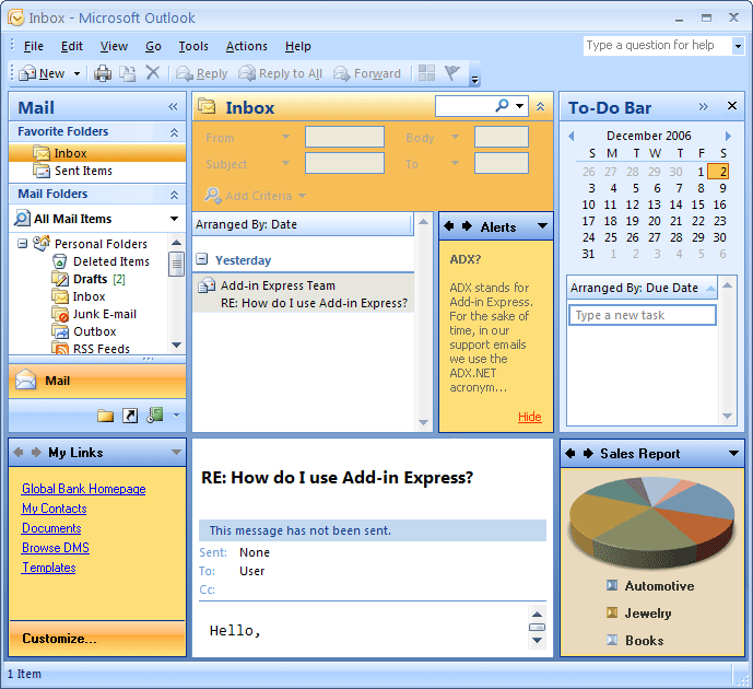 在2007版本中,高级Outlook自定义功能为您的Outlook plug-ins提供了一个独特的图形用户界面。现在您可以在Outlook的窗口中使用任意的.NET窗体和控件,比如在Outlook的查阅窗口、电子邮件窗口、任务窗口、行程提醒窗口、导航面板、立即工具条等。所有的Outlook版本多支持透明效果。