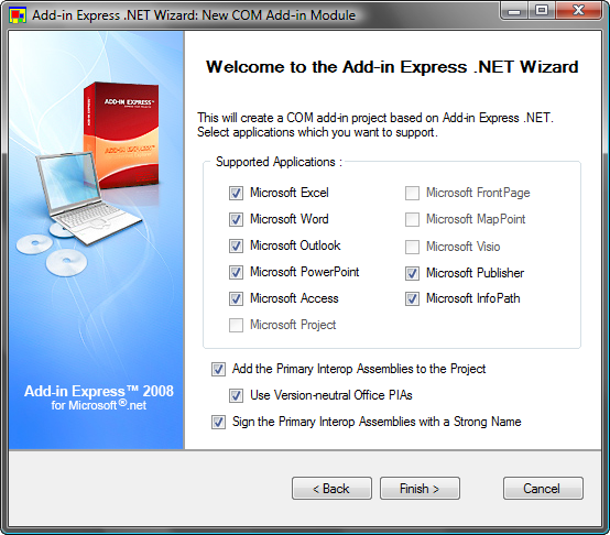 Add-in Express is rendered a true "must have Office tool" by its optimized version-neutral core. Written in C# and based on the .NET Framework, COM interoperability and low-level Windows API, it will make your Office plug-ins commercial-class and industry-leading. Now there's no need to create Office version-specific or application-specific solutions and deployment packages or search for intricate tricks, and then combine all this stuff into one resulting package. One version-neutral and multi-hosted Office plug-in project and one setup project is quite enough to support all applications and all currently available versions and editions of Microsoft Office, from 2000 to 2010, from Outlook to Visio, from Student and Home to Pro and Enterprise Office editions. It is this approach that was chosen by thousands of developers who build their Office add-ins on Add-in Express.