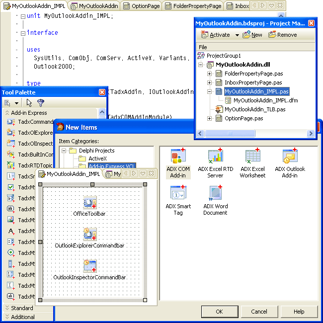 Add-in Express VCL is the first visual tool for writing a COM add-in, smart tag and RTD server in Delphi. It completely supports these technologies and makes them very comfortable for programming extensions for all available Microsoft® Office versions across 2000 through Microsoft Office 2010.