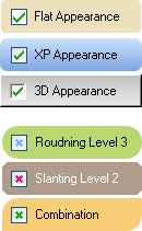 • 当鼠标移动时,内建了 Windows XP, Office 2003, 3D, Flat, Bevel, CoolButton, XP 等效果, 在鼠标移动在可以应用在 Windows 98, Me, NT 4.0, 2000, XP, 以及 Vista 下面的外观和风格时,内建有 3D 效果。