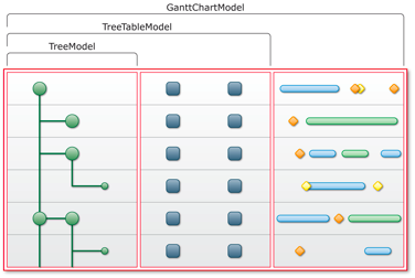 FlexGantt 遵从与 Swing 相同 MVC 方法。许多不同的模型用于各种各样的用途。一个日历模型跟踪假日和周末。一个页面模型支持使用者加载不同的计划范围,一个书签模型存储了应用程序和用户自定义书签。然而,首要的模型是甘特图,它为甘特图组件提供数据。它是树状图模型的延伸,因此它能在甘特图的左手边填上数据(左手边是树状图)。它同样返回成为时间线的对象显示在右手边时间线的下方。时间线对象代表活动、工作、事件、重要事件,甚至任何可以放在时间线上的事情,因为它可以被连接到时间点或时间区。下面的图片显示了甘特图模型的结构。