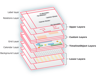 FlexGantt uses a very unique layering approach that is known from graphics and mapping applications. Each Gantt chart consists of a set of system layers, which provide the core functionality (e.g. a drawing vertical grid lines) and a set of layers dedicated to rendering timeline objects (activities, events, milestones, ...). The picture below depicts the layer stack. Applications can add as many timeline object layers as they like, allowing them to easily group objects and show or hide them all at once. Layers also support transparency so that overlapping timeline objects can be easily identified.