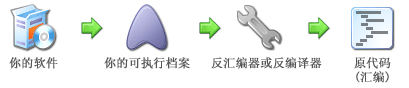 当 一个软件破解者尝试破解一个编译过的程序时,他会使用反 编译器 具将机器语言代码反 编译 成另一种更容易让人明白的代码(例如 汇编语言 或者一种更高级的 程序语言 ),然后对于这反 编译 成的语言进行研究。