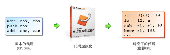 当 一个软件破解者尝试对一组受到 Code Virtualizer 保护的代码进行 反编译时,他无法找到任何本来的 x86 指令,而只会发现一个他或其它特别的 反编译器 完全陌生的、新的指令集。这将迫使 软件破解者使用非常多的努力来研究每一行的代码的意思以及学习每一个受保护程序内的虚拟机器的运作原理。 Code Virtualizer 完完全全地对虚拟码的运行以及个别虚拟机器的学习进行了搅乱,以阻止任何人学习当中的虚拟码是如何运作的。