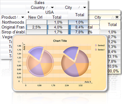 The OLAP + CHART ModelKit™ package includes OLAP ModelKit™ – an OLAP component for multidimensional data analysis; and Chart ModelKit™ – a component for graphical data representation. The integration of the components provides an advanced and intuitive user interface specifically built for OLAP pivoting, slicing, drilldown and data visualization in the form of interactive charts and graphs. The functionality of OLAP technology, rich library of series types and the ability to use any .Net data sources allow the creation of effective decision support systems.