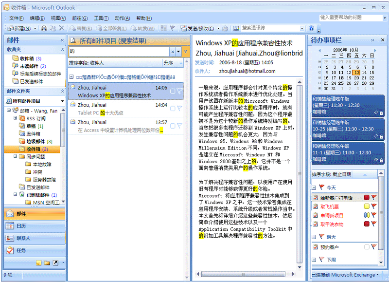 Office Outlook 2007 包括即时搜索功能,可以在任何 Outlook 模块中快速查找信息。Office Outlook 2007 可找到相关条目并突出显示。