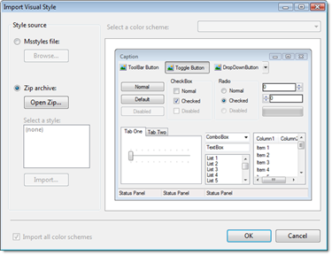 After selecting a Zip file the dialog will display a list of all msstyles in the Zip archive. You can then select which style to import from using the style listbox. Click Import, and the visual style will be extracted from the zip and displayed.