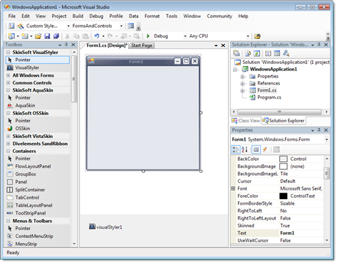 VisualStyler uses the latest smart-tag designers making the component extremely easy to setup and use, and for a fully skinned design-time experience you can use the supplied Visual Studio add-in which extends Visual Studio to support WYSIWYG skinning on all forms, controls and user controls. So you can now design your skinned application GUI just as you would with any other normal windows forms application.