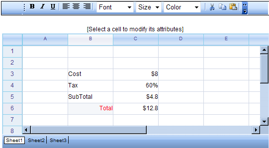 Spread includes a powerful calculation engine that allows you to quickly add formulas to your web applications by using any of over 300 pre-defined functions or you can add your own custom functions. Spread also supports cross-sheet formula referencing. In the below sample, formulas are in the 'Total Due' column and the last totals row. Enter or change a formula in a cell - "=SUM(A1:A3)" - then press the Update image link (the checkbox at the bottom left of Spread) to view your changes.