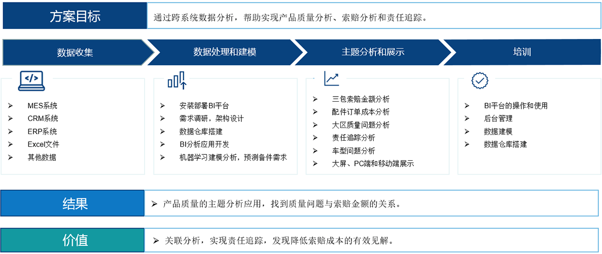 创建 产品质量的主题分析应用,找到质量问题与索赔金额的关系,追踪质量问题,找到问题时间分布、国家地区、车型、操作人员、配件供应商的关系。