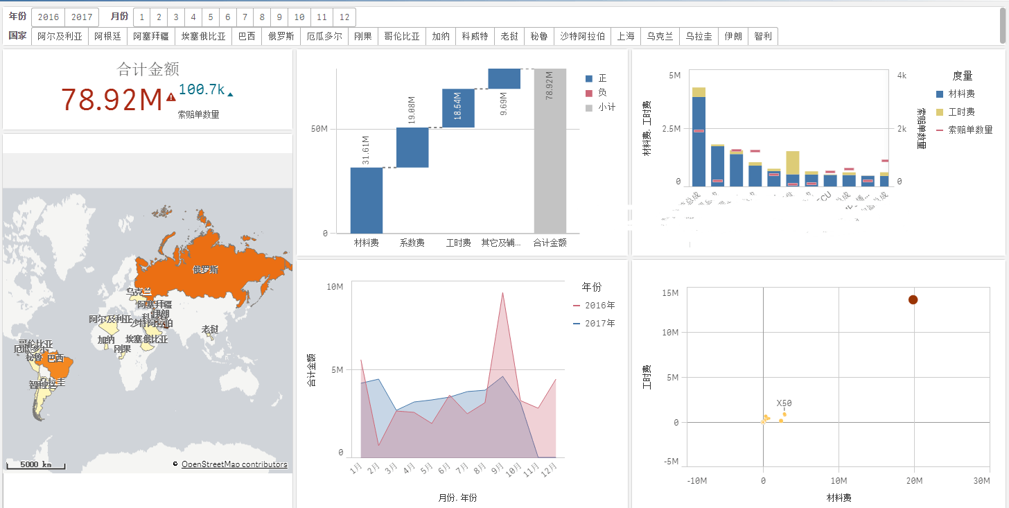 需要针对全球客户索赔情况进行分析,分析成本维度、时间维度、国家维度、故障维度等的相关性。
