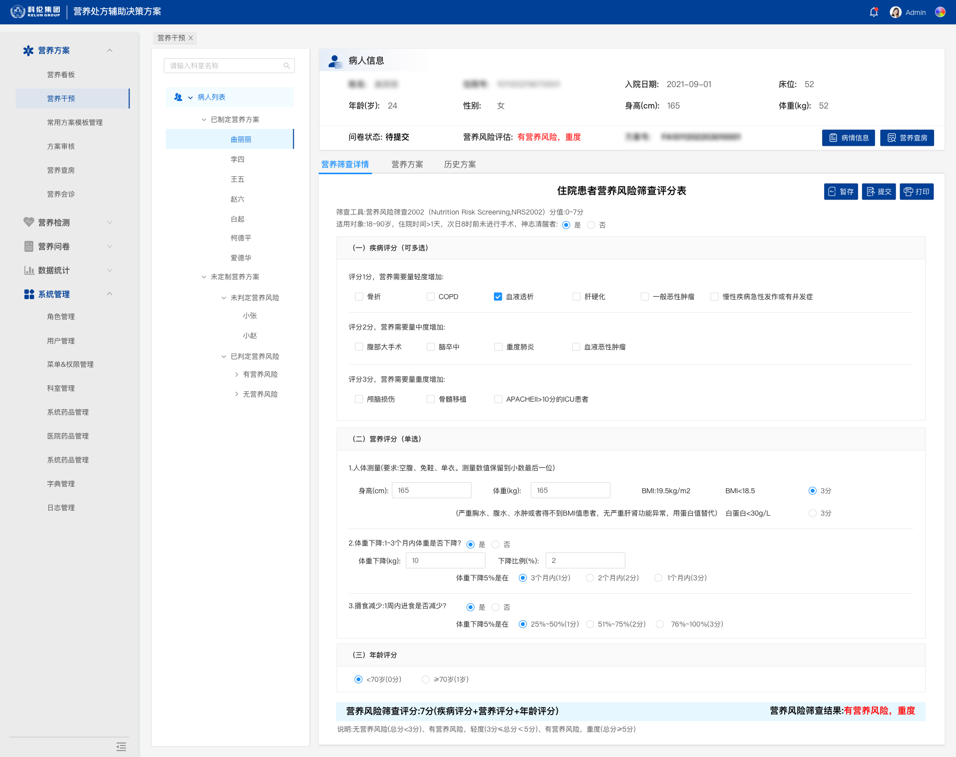 利用领先的大数据AI算法技术,自动生成营养风险筛查结果以及肠内肠外的营养用药方案。