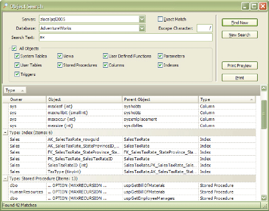 Object Search allows you to search for any objects within a specific database with support for wildcards and loose matching.