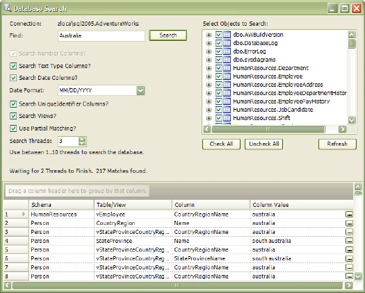 The Text Search feature searches for data text matches in tables and views. By checking boxes besides table and view names you are able to filter in only specific objects. Also you are able to choose additional filter options like search text type columns, search date columns, search UniqueIdentifier columns, search Views, to use partial matching.
