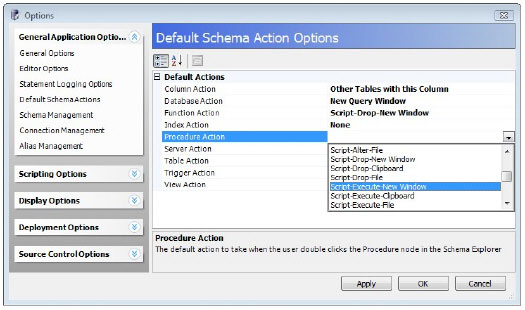 ApexSQL Edit allows full granular customization of menu actions (i.e. Double click) on an object specific basis. For example, double clicking a Table might open it for editing but double clicking a Procure might script it to the editor. Entirely new menus can be custom designed and added to the existing context menu for that object.