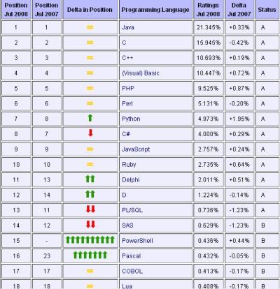 值得注意的是,PowerShell(原开发代号Monad)排名突飞猛进,份额比去年同期上升0.44%,从20名外杀入排行榜前15名。作为微软在06年第四季度推出的一种新的命令行外壳和脚本语言,PowerShell主要用于进行系统管理和自动化,被认作是DOS下批处理语言的最佳承继者,已经逐渐显示出下一代脚本的潜力,极有可能在接下来的几年内成为Windows管理员最重要的语言。它建立在 .NET Framework 的基础上,全面支持Windows最新的服务器产品,包括SQL Server 2008、Windows Server 2008。