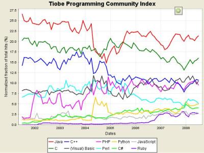 2008年7月份的开发语言排行榜已经出炉,前三甲的排名仍然没有变化,仍然由Java、C、C++牢牢占据,三者的流行比例分别是21.3%、15.9%和10.7%,Java和C++的流行度在缓慢上升,C的比例虽有所下降,但由于其在需要对系统以及硬件进行操作的开发上的效率和稳定性方面仍据优势,短时间内在三甲内的位置也不会被动摇。