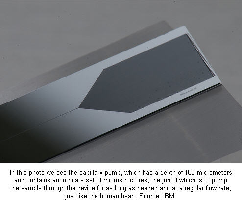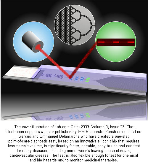IBM公司最近开发出了一种基于芯片的,可以快速进行诊疗的医疗检测系统,这种系统只需要少量的样本便可以检测出多种疾病。这套系统的推出,意味着医生能 在病人心脏病发后马上便能对病人进行检测,并由此提高病人的救治生还率。这套系统可以利用毛细效应来对人体血液中的病源体进行检测。