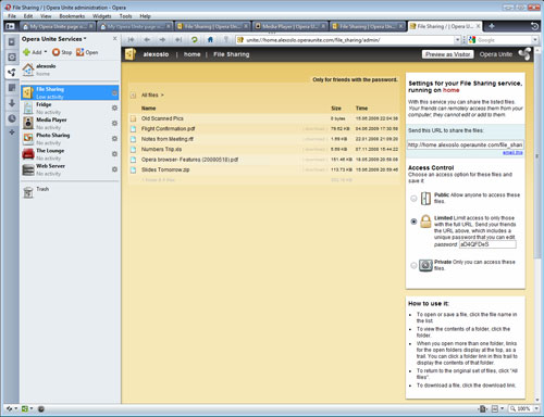 Opera Unite能够提供一系列服务,例如文件共享、网络服务器、媒体播放器、照片共享、聊天服务,以及笔记交换等。Opera希望开发者能利用Opera Unite提供的服务,并向其中加入更多功能。