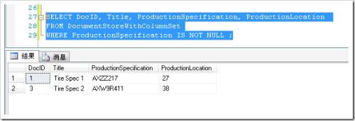 SELECT DocID, Title, ProductionSpecification, ProductionLocation FROM DocumentStoreWithColumnSet WHERE ProductionSpecification IS NOT NULL ;