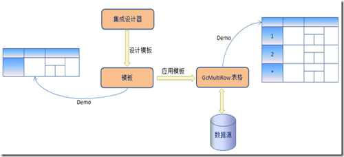 MultiRow的主框架如下图所示。首先,通过集成设计器设计适合于业务需求的模板,并把模板应用于MulitRow控件,之后把MultiRow绑定到相关的数据源(或者直接使用MultiRow的非绑定模式),这样数据源的每一条数据记录将会根据所设计的模板进行呈现。由于MultiRow支持.NET标准Windows窗体数据绑定模型,因此,大多数情况下只需设置DataSource属性即可。