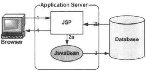 从上图可以看出来,JSP是整个应用系统的门户。它身兼三职啊。1、负责与客户端的所有通信 2、处理所有的请求 3、处理所有的答复。在处理答复的时候,从数据库中存取数据有两种方式,可以它自己直接去存取,也可以让一些 JavaBean来完成。因为JavaBean可以被放在一个请求上下文或者用户会话中,这样就可以在不同的JSP之间通信。当然这种模式在进行快速和需求不是很复杂,规模较小的 Web应用是有很大的优势的,比如说:JSP页面可以非常容易地结合业务逻辑(jsp:useBean)、服务端处理过程(jsp:scriplet)和 HTML(<html>),在JSP页面中同时实现显示,业务逻辑和流程控制,从而可以快速地完成应用开发。