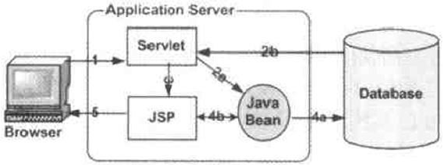 对比这个图跟Model 1的结构图,从 JSP这个角度来看,JSP页面至少少了二个任务即获取跟处理用户的请求,因为Servlet相当于控制器(Controller)角色,它负责接收客户端请求并处理此请求,将它传递给合适的JSP,而JSP则显示给用户。所以JSP页面这时候主要做两件事情: JavaBean直接与数据库打交道取得数据后,JSP从JavaBean中读取数据,这是第一,第二件事情就是把结果返回给客户端。