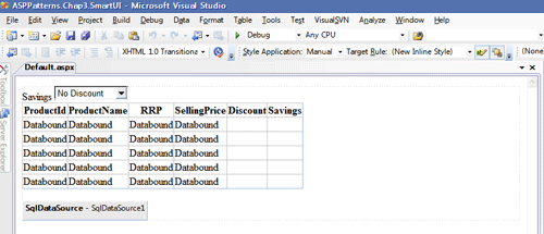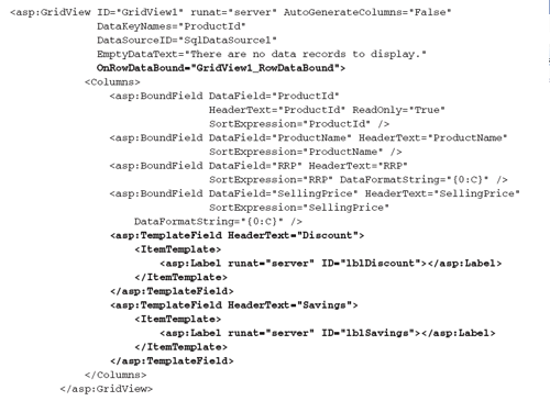 6. 我我们添加额外的两列来显示折扣信息和库存信息。Default.aspx的Source代码最后如下: