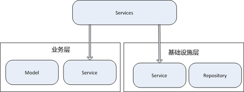 其实在Repository上的那个Service也是同样的概念。例如发送邮件通知用户的功能。例如上图中的最上层的Service可以调用业务层和基础设施层的Service来共同完成一个事情。