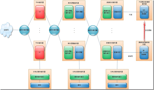除了高伸缩性之外,还有如何保证高性能。即应用程序必须是良好设计的。在每一个Tier的内部,可以采取一些措施让应用程序的执行效率达到最高。让硬件的资源得到充分的利用。这有一些策略,如缓存。减少访问数据库的次数,等等。以下是一个可伸缩的asp.net应用系统的整体映象图: